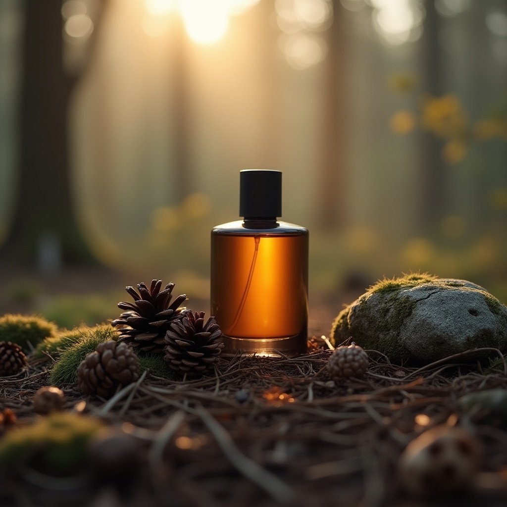 Unveil the essence of rugged sophistication with this matte brown perfume bottle, elegantly set atop dry wood bark, scattered pinecones, and moss-kissed rocks. Inspired by the heart of the forest, its earthy aroma captures the depth of nature—rich, grounding, and mysterious. The foggy woodland backdrop evokes a sense of calm and solitude, drawing you into a world where wildness meets refinement. This woody, aromatic fragrance is ideal for those who appreciate bold character and natural strength. Perfect for cooler seasons or evening wear, it lingers with notes of pine, oak, and forest moss. Embrace the raw beauty of nature in every spray—earthy, timeless, and deeply masculine.